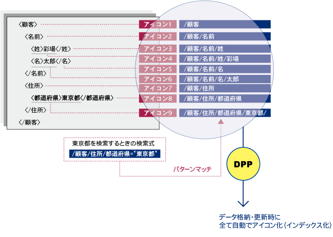 In NeoCore, the XML database (XML-DB), high-speed attribute-level searches—impossible with traditional full-text search engines—are made possible through the use of the W3C-standard query language XQuery and NeoCore’s proprietary DPP (Digital Pattern Processing) technology. This enables ultra-fast search performance, completely unaffected by the size or structure of the XML data. In contrast, when handling XML in relational databases (RDBs)—whether mapping XML to table structures or storing it in XML data fields—search performance can degrade significantly. With NeoCore, the DPP engine ensures stable, high-speed searches regardless of XML data volume or hierarchical depth. When XML data is stored, it passes through a parser and is then processed by a module called the Flattener, which breaks it down into paths and values. DPP then converts each path and value into a fixed 64-bit structure, generating a unique “icon” for every tag. This icon-based approach allows NeoCore to search without referring to the original XML structure. Instead, it pattern-matches the flattened icons—functioning as indexes—and uses them to pinpoint where the actual data is stored.