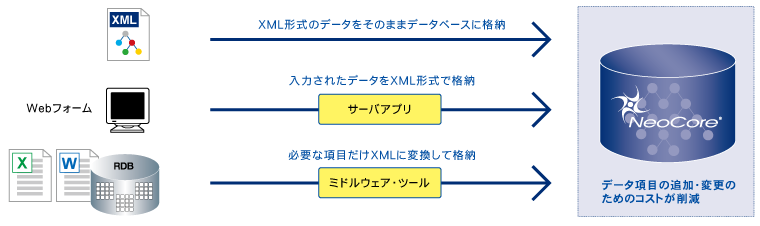 NeoCore, an XML database, does not require schema definitions when storing XML data. When storing or updating XML data, NeoCore performs only well-formedness checks (parsing) and does not conduct validation against DTDs or XML Schemas. Therefore, it can store any XML format data independently of DTD or XML Schema, allowing you to freely add or remove elements as needed. Relational databases (RDBs) require strict schema definitions for all stored data, meaning that any specification changes necessitate redefining the schema. In contrast, database design using NeoCore involves structuring nodes and attributes in a tree format and modifying this tree structure with performance considerations in mind. While RDBs require the structure design to be finalized before implementation, NeoCore allows for some degree of structural changes to be handled within the application, as long as the basic framework is established. This approach significantly reduces the system engineering costs and time associated with schema design and index redesign driven by business-side requirements. It offers major advantages, especially when the data structure cannot be precisely defined in the early stages of system development or when adding or modifying data fields during the system operation phase. Furthermore, these processes manage large volumes of schema-less XML data while maintaining ACID properties*, enabling robust XML data management with high reliability as a DBMS. ACID properties: The four key characteristics required for transaction processing, which manages multiple related operations as a single unit of work.